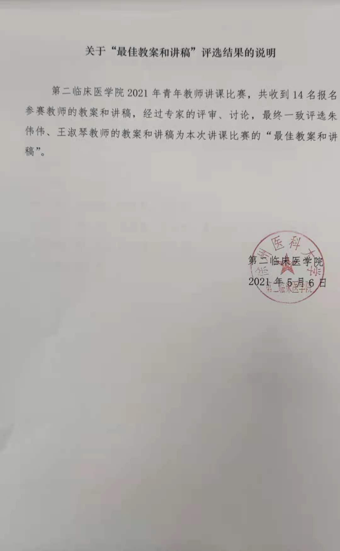 黃淮網(王露 高暢) 4月29日,徐州市兒童醫(yī)院劉金鳳、姚紅、王淑琴三名優(yōu)秀青年教師,參加了徐州醫(yī)科大學第二臨床醫(yī)學院舉辦“2021年第二臨床醫(yī)學院青年教師講課比賽”,三人均獲得講課比賽三等獎;王淑琴老師獲得“最佳教案和講稿獎”二等獎。