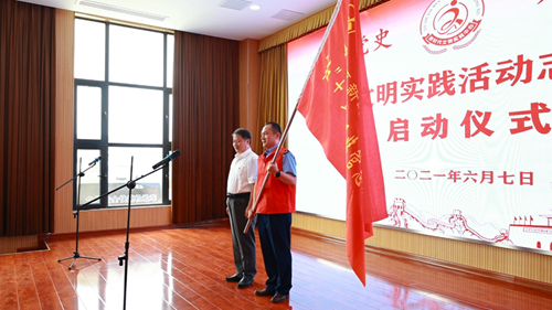 市委常委、市委宣傳部部長(zhǎng)、市委黨史學(xué)習(xí)教育領(lǐng)導(dǎo)小組副組長(zhǎng)、辦公室主任徐東海為賈汪區(qū)“紅+藍(lán)”市場(chǎng)監(jiān)管志愿服務(wù)隊(duì)授旗。