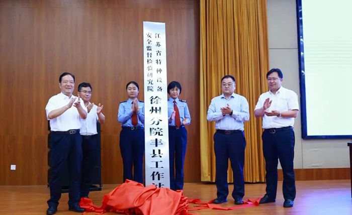 ▲ 揭牌儀式上,何西環(huán)、吳德法、鹿飛、顧永華共同為“省特檢院徐州分院豐縣工作站”揭牌,其他領(lǐng)導(dǎo)現(xiàn)場見證。