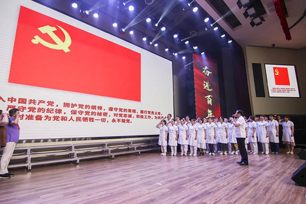 今年,黨中央首次頒發(fā)“光榮在黨50年”紀(jì)念章,頒發(fā)對(duì)象是黨齡達(dá)到50周年、一貫表現(xiàn)良好的黨員。在黨的百年征程中,許多徐州市一院的老黨員堅(jiān)定地跟隨黨的腳步,經(jīng)歷了艱難的重重考驗(yàn),走過了難忘的崢嶸歲月,為國(guó)家衛(wèi)生健康事業(yè)發(fā)展揮灑了汗水。杜鐘祥、丁繼存為“光榮在黨50年”的老干部黨員代表頒發(fā)紀(jì)念章。隨后,杜鐘祥帶領(lǐng)院領(lǐng)導(dǎo)班子成員、黨員干部及新老黨員代表一起莊嚴(yán)宣誓,重溫入黨誓詞。