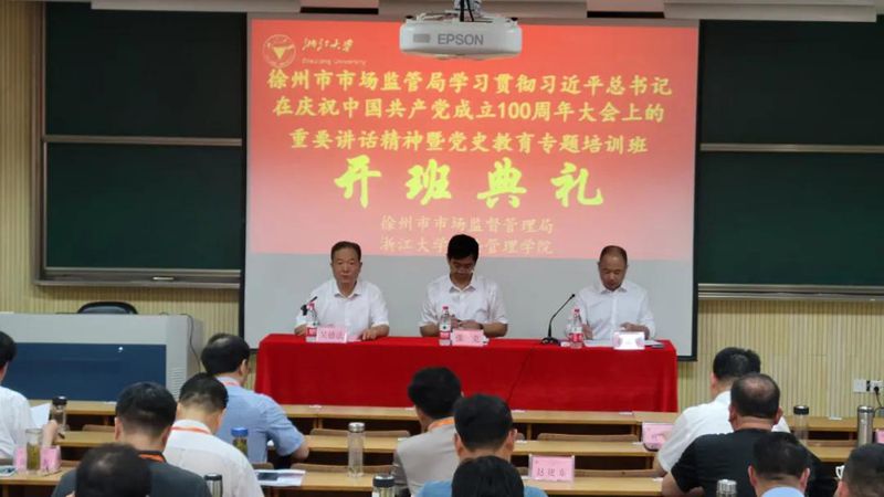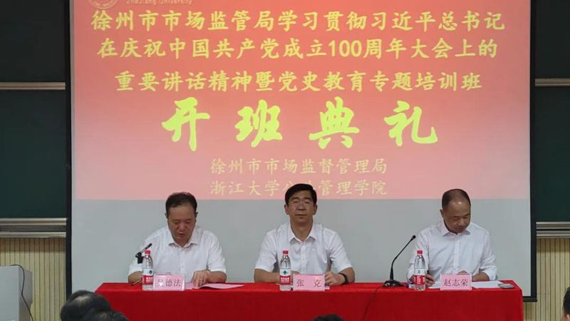 黃淮網(wǎng)(徐仕評 費堅真)  7月5日,徐州市市場監(jiān)管系統(tǒng)在浙江大學公共管理學院,舉辦學習貫徹習近平總書記在慶祝中國共產(chǎn)黨成立100周年大會上的重要講話精神暨黨史教育專題培訓班。浙江大學公共管理學院院長趙志榮現(xiàn)場致辭,徐州市人民政府副市長張克做開班動員講話,市局黨委書記吳德法主持開班儀式。