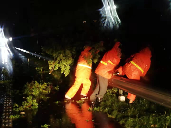 28日晚9時,睢寧公路站王林養(yǎng)護工區(qū)主任張威同志帶領(lǐng)養(yǎng)護工人雨中巡查道路,巡查至省道612線時,發(fā)現(xiàn)沿線一棵新栽植不久的行道樹出現(xiàn)倒伏現(xiàn)象,存在道路通行隱患。為了迅速恢復(fù)路面交通,面對倒伏的路樹,張威同志和5名養(yǎng)護人員冒著風(fēng)雨合力將路樹扶正,并樹枝清理干凈,凌晨12點多,在車燈的照射下,張威他們終于清完最后一個路障,保證了公路的安全暢通。