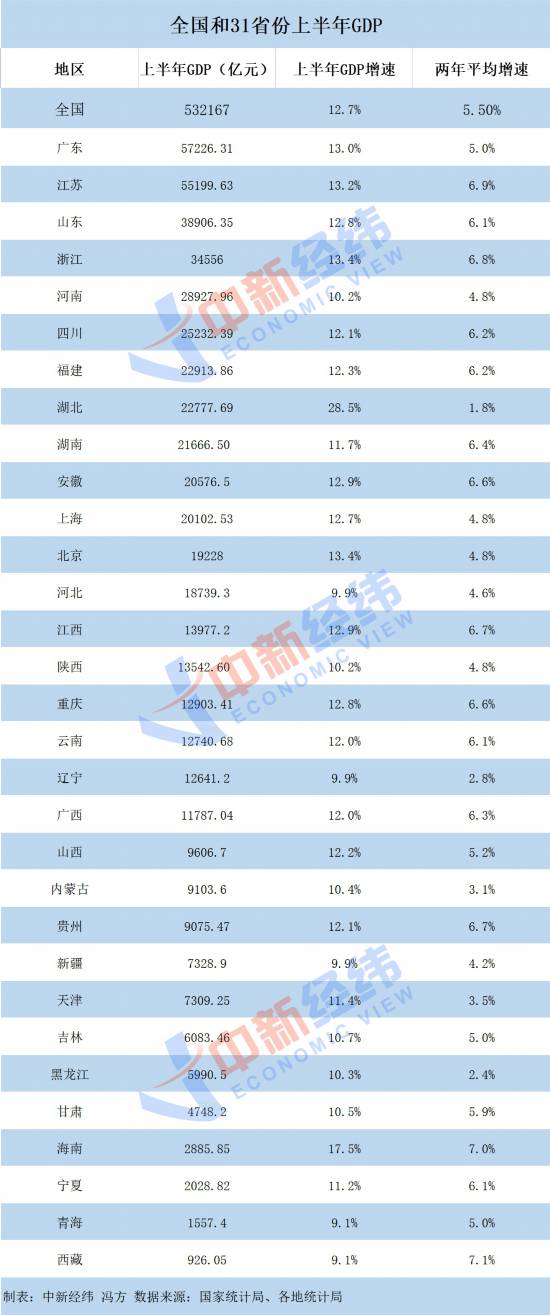 此外,河北、遼寧、新疆、青海、西藏上半年GDP增速排名靠后,均未達到兩位數(shù),分別為9.9%、9.9%、9.9%、9.1%和9.1%。