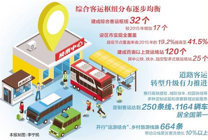 “綜合客、貨運樞紐‘無縫化’‘零換乘’‘一體化’‘多式聯(lián)運’等先進理念和模式已深入人心,客、貨運樞紐規(guī)劃建設(shè)工作逐步邁入正軌。”省交通運輸廳副廳長汪祝君說。綜合客、貨運樞紐作為各種運輸方式集成融合的中樞,以及區(qū)域、城市和城市群之間的有機銜接,是現(xiàn)代綜合交通運輸體系的重要標志。5年中,江蘇綜合客運樞紐分布逐步均衡,建成綜合客運樞紐32個,較2015年增加17個,設(shè)區(qū)市實現(xiàn)全覆蓋,縣級節(jié)點覆蓋率由2015年的19.2%提高至41.5%。建成百畝以上貨運場站120個,其中公鐵、鐵水、陸空型多式聯(lián)運場站25個。同時,推行高鐵接駁、城際快車、校園快線等多種定制運輸和旅客聯(lián)程運輸服務,定制客運達到250條線、1164輛車,居全國第一。