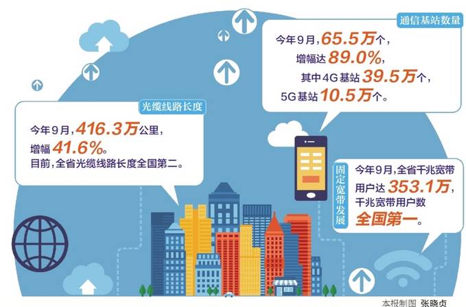 2016年底,通信基站共38.1萬個,其中4G基站20.9萬個。截至今年9月,通信基站達(dá)65.5萬個,增幅達(dá)89.0%,其中4G基站39.5萬個,5G基站10.5萬個。全省實現(xiàn)5G覆蓋的縣級行政區(qū)達(dá)107個、鄉(xiāng)級行政區(qū)達(dá)1510個,92.2%的鄉(xiāng)鎮(zhèn)覆蓋率在各省中排名第一。