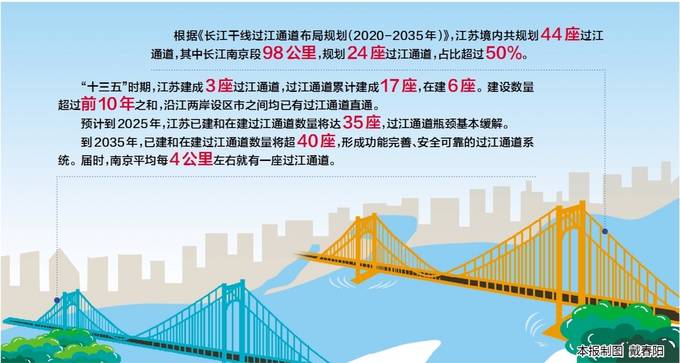 根據(jù)《長江干線過江通道布局規(guī)劃(2020-2035年)》,江蘇境內(nèi)共規(guī)劃44座過江通道,其中長江南京段98公里,規(guī)劃24座過江通道,占比超過50%。預(yù)計到2025年,江蘇已建和在建過江通道數(shù)量將達(dá)35座,過江通道瓶頸基本緩解。到2035年,已建和在建過江通道數(shù)量將超40座,形成功能完善、安全可靠的過江通道系統(tǒng)。南京過江通道建設(shè)在全省過江通道格局中占有舉足輕重的地位,屆時,平均4公里左右就有一座過江通道。