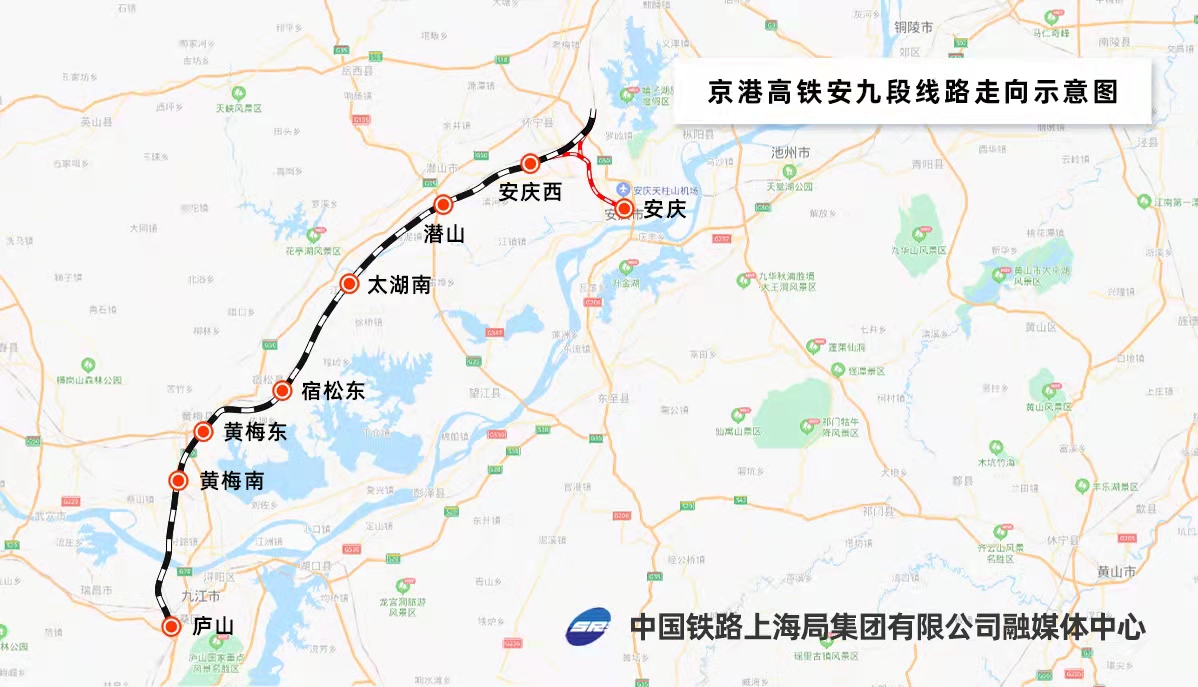 京港高鐵安九段自安慶西站引出,經(jīng)安徽省安慶市懷寧縣、潛山市、太湖縣、宿松縣,湖北省黃岡市黃梅縣,終至江西省九江市廬山站,線路全長(zhǎng)176公里,設(shè)計(jì)時(shí)速350公里,全線共設(shè)安慶西、潛山、太湖南、宿松東、黃梅東、黃梅南、廬山7座車站,其中廬山站為既有車站。