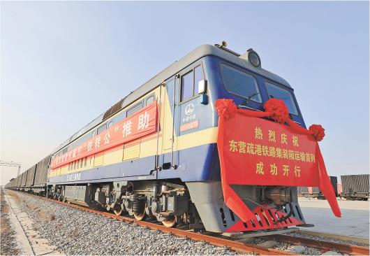 1月16日上午,一輛載有120個(gè)集裝箱的貨運(yùn)列車停靠在東營(yíng)港疏港鐵路東營(yíng)港站,這標(biāo)志著東營(yíng)港疏港鐵路首列集裝箱列車成功開行。