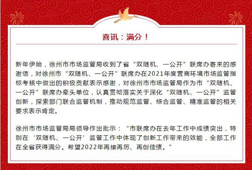 徐州市市場監(jiān)管局局領(lǐng)導(dǎo)作出批示:“市聯(lián)席辦在去年工作中成績突出,特別在‘雙隨機(jī)、一公開’監(jiān)管工作中體現(xiàn)了創(chuàng)新工作帶來的效能,全部工作在全省獲得滿分。希望2022年再接再厲、再創(chuàng)佳績。”