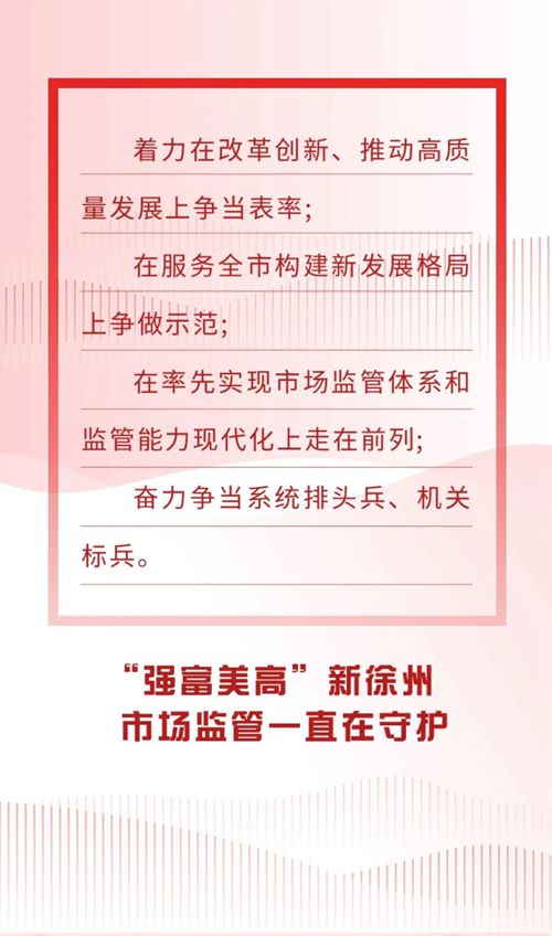 歲月不居,天道酬勤;厥走^(guò)去的一年,徐州市場(chǎng)監(jiān)管人不畏酷暑,不懼嚴(yán)寒,無(wú)論晝夜,風(fēng)雨兼程,團(tuán)結(jié)一致,凝心聚力,在以習(xí)近平新時(shí)代中國(guó)特色社會(huì)主義思想的科學(xué)指引下,在各級(jí)黨委的堅(jiān)強(qiáng)領(lǐng)導(dǎo)下,用實(shí)際行動(dòng)開(kāi)拓進(jìn)取,攻堅(jiān)克難,聚焦高質(zhì)量發(fā)展,聚力高水平監(jiān)管,奮力譜寫(xiě)徐州市場(chǎng)監(jiān)管新篇章。