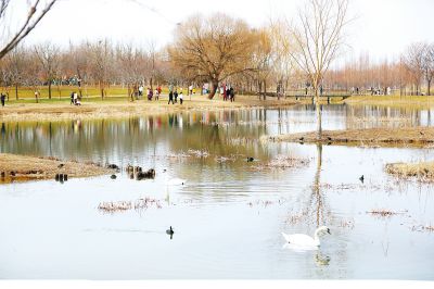 春暖花開,鄭州北龍湖濕地公園內(nèi)的天鵝、野鴨與游客和睦相處。