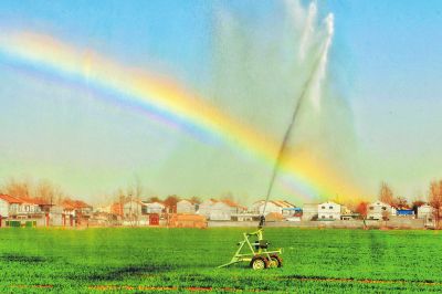 上圖春日融融,柘城縣老王集鄉(xiāng)農(nóng)民利用大型自走式噴灌機給小麥澆返青水,噴射出的水花在陽光的折射下,映現(xiàn)出一道美麗的彩虹。張子斌 攝