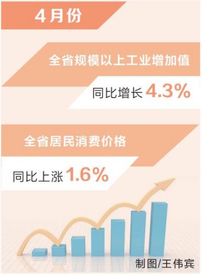 民生保障有力。物價水平保持溫和上漲。4月份,全省居民消費價格同比上漲1.6%,漲幅比上月擴大0.6個百分點。消費數(shù)據(jù)顯示,居民基本生活保障有力。