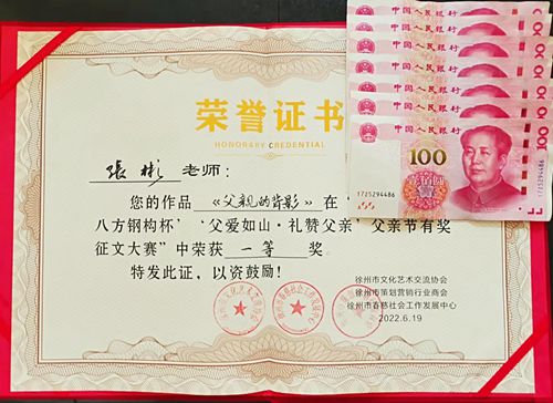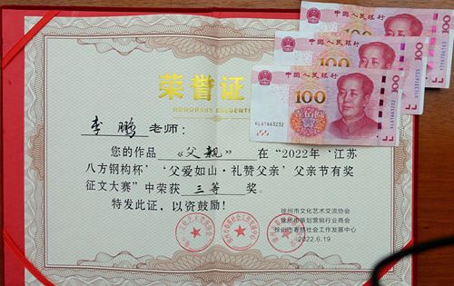 此次“江蘇八方鋼構(gòu)杯”父親節(jié)征文大賽經(jīng)專家組王景陶、李繼玲、王敏、孫新娟四位老師根據(jù)征文作品的主題思想、文字能力、文學(xué)功底、謀篇布局、邏輯思維、文風(fēng)創(chuàng)意等,對(duì)匿名的每篇文章進(jìn)行嚴(yán)格打分,認(rèn)真評(píng)審。最終,由市職工詩聯(lián)協(xié)會(huì)會(huì)長李敏進(jìn)行獨(dú)立核分、算出總分,按照得分高低評(píng)出一、二、三等獎(jiǎng)各1名,優(yōu)秀作品獎(jiǎng)13名,并宣布獲獎(jiǎng)結(jié)果,由交流協(xié)會(huì)會(huì)長李堅(jiān)強(qiáng)、江蘇八方鋼構(gòu)集團(tuán)有限公司行政總監(jiān)孫琦,王景陶老師、策劃商會(huì)會(huì)長趙杰,交流協(xié)會(huì)副會(huì)長馮艷春、中恩傳媒副總經(jīng)理孫偲分別為獲得一、二、三等獎(jiǎng)的張彬、張尊浩、李鵬頒獎(jiǎng)。張尊浩、孫新娟、呂繼傳、黃繼發(fā)、楊元宇等為優(yōu)秀獎(jiǎng)的獲得者姜寬、解紅、時(shí)善文、單克鋒、章強(qiáng)、陳開靈、郎海霞、李靜、余偉、安月蘭、晨馳、苗磊、趙玉強(qiáng)頒發(fā)了證書和獎(jiǎng)品。書畫藝術(shù)家沈廣松、黃繼發(fā)、張彬、姜寬、魏薇等分別為冠名單位、贊助單位惠贈(zèng)了書畫作品。接著,李堅(jiān)強(qiáng)、孫琦、王景陶、張尊浩共同開啟新書,協(xié)會(huì)會(huì)員、著名作家、非遺剪紙傳承人解紅現(xiàn)場(chǎng)贈(zèng)送了協(xié)會(huì)《五載·前行》剪紙作品,安月蘭現(xiàn)場(chǎng)高歌一曲《父親》,把整場(chǎng)活動(dòng)推向高潮。
