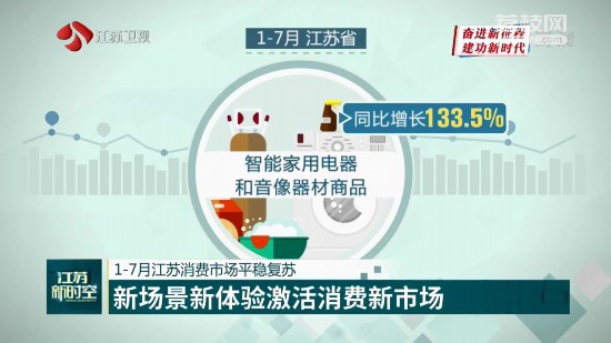 與此同時,江蘇也加大了居民購買智能、綠色家電、家具的補貼。實惠加方便,使得“新”家電迅速在市場走俏。1-7月,智能家用電器和音像器材商品同比增長133.5%。其中,7月當(dāng)月能效等級為1級和2級的商品、智能家用電器和音像器材增速較6月份分別提升37.3個、39.9個百分點,綠色節(jié)能家電專項活動效果進一步凸顯。另一方面,門店社群的各類活動也帶活網(wǎng)絡(luò)消費,1-7月,全省線上通過公共網(wǎng)絡(luò)實現(xiàn)的零售額1555.5億元,同比增長15.0%。