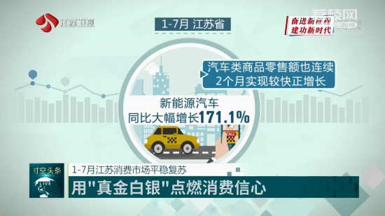 最大宗零售商品——汽車同樣表現(xiàn)搶眼。今年,國家陸續(xù)出臺購置稅減征、新一輪新能源汽車下鄉(xiāng)等政策。江蘇還通過發(fā)放汽車消費券、加大充電設(shè)施補貼等活動,提振消費信心。多項利好疊加,1-7月,新能源汽車同比大幅增長171.1%,汽車類商品零售額也連續(xù)2個月實現(xiàn)較快正增長。
