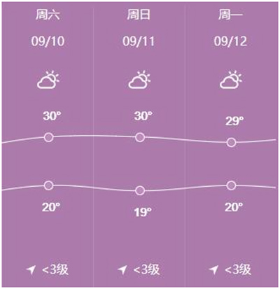 根據(jù)氣象部門預測,9月10日至12日徐州天氣以多云為主,最低氣溫19℃左右,最高氣溫30℃左右(天氣多變,請以最新預報為準).