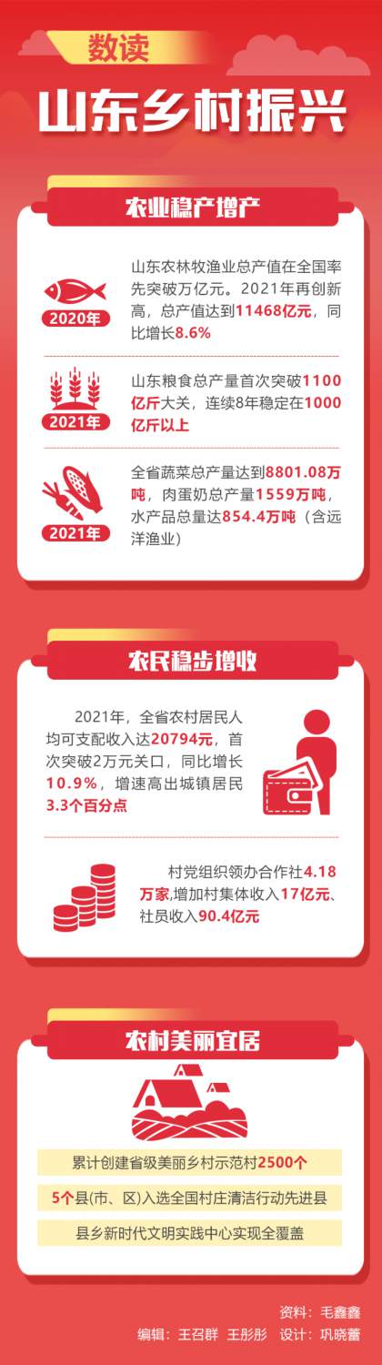 牢記總書記囑托,山東突出產(chǎn)業(yè)支撐,鄉(xiāng)村振興基礎(chǔ)越來越好。加快構(gòu)建現(xiàn)代農(nóng)業(yè)產(chǎn)業(yè)體系,煙臺(tái)蘋果、壽光蔬菜等產(chǎn)業(yè)集群邁向千億級(jí)。一大批龍頭企業(yè)創(chuàng)新發(fā)展,新型經(jīng)營(yíng)主體數(shù)量居全國前列。休閑農(nóng)業(yè)、創(chuàng)意農(nóng)業(yè)等新業(yè)態(tài)競(jìng)相涌現(xiàn)。2021年,我省農(nóng)村居民人均可支配收入20794元,比上年增長(zhǎng)10.9%。
