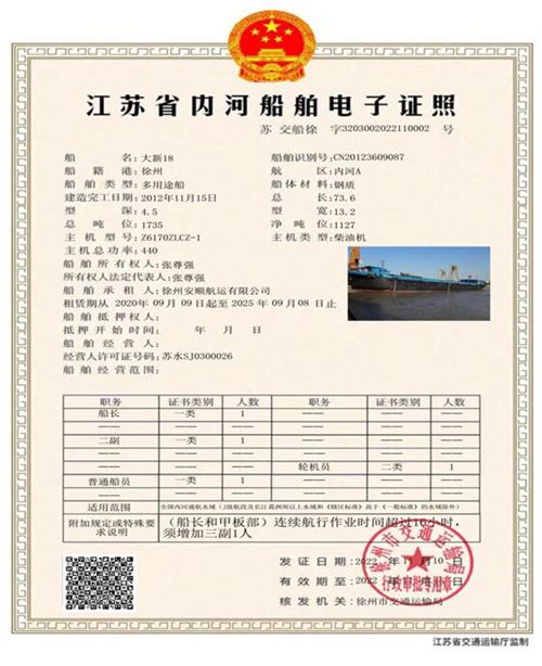 徐州安順航運有限公司負責人張先生在手機上看到了公司“大新18”號船舶的電子證照,這也是徐州市簽發(fā)的首張內(nèi)河普通貨船“多證合一”電子證書。張先生說:“以前像我們申請辦理船舶各類證書要跑好幾個部門,船舶證書多達十幾種,對航運企業(yè)而言,辦理周期長、跑辦次數(shù)多,且不便于攜帶、保管很不方便,嚴重影響了航運效益的發(fā)揮,也成為內(nèi)河航運在優(yōu)化營商環(huán)境方面的短板,F(xiàn)在只要到一個窗口去一次就都能辦齊了,手機掃一下就能查得到,真是太方便了。”
