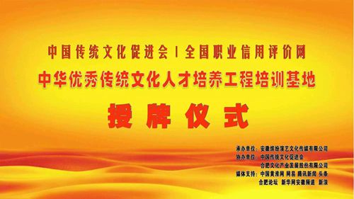 為了讓中華優(yōu)秀傳統(tǒng)文化全方位融入思想道德教育、文化知識(shí)教育、藝術(shù)體育教育、社會(huì)實(shí)踐教育各環(huán)節(jié),貫穿于啟蒙教育、基礎(chǔ)教育、職業(yè)教育、高等教育、繼續(xù)教育各領(lǐng)域,由“中國傳統(tǒng)文化促進(jìn)會(huì),全國職業(yè)信用評(píng)價(jià)網(wǎng)”授權(quán)的安徽省繽紛演藝文化傳媒有限公司,中華優(yōu)秀傳統(tǒng)文化人才培養(yǎng)工程訓(xùn)練基地揭牌成立。