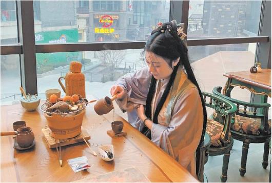 冬日午后,一只小火爐,一張鐵絲網(wǎng)盤,一柄茶壺,旁邊擺放著精致茶點(diǎn)……1月22日大年初一,在位于濟(jì)南泉城路的山東手造展示體驗(yàn)中心的“叮咚茶社——非遺主題茶餐廳”,不少市民趁春節(jié)假期前來體驗(yàn)圍爐煮茶(上圖)。壺中茶湯翻滾,壺蓋隨之跳動,烤網(wǎng)上烘烤著紅薯、花生、橘子和紅棗。大家圍桌而坐,品茗談笑,好不愜意。
