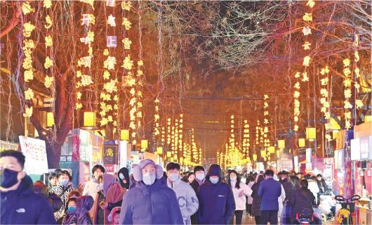 春節(jié)假期,聊城市古城步行街的春節(jié)主題古詩詞燈飾流光溢彩,一步一詩,吸引游客徜徉其間,駐足吟誦詩句,拍照留念。(盧鵬 許文豪)