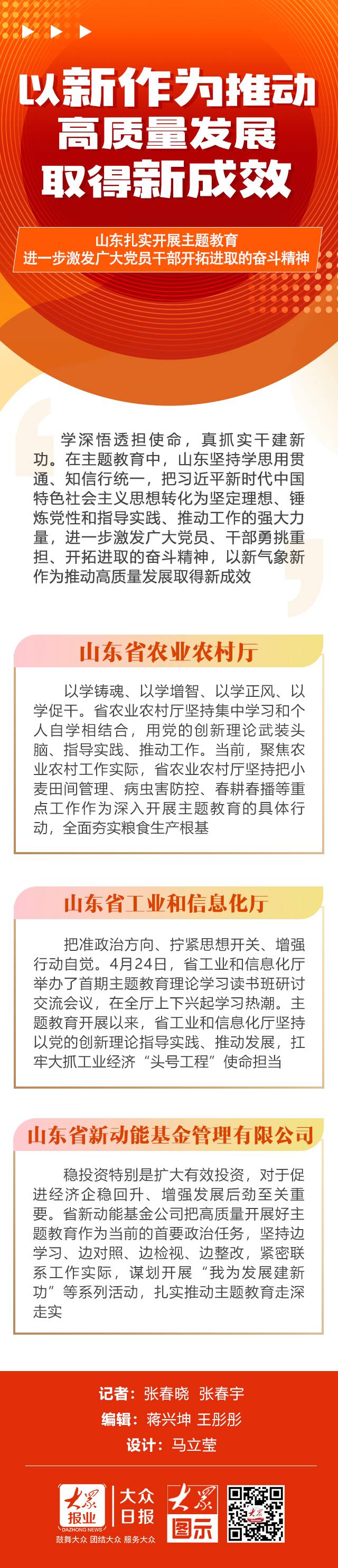 學(xué)深悟透擔(dān)使命,真抓實(shí)干建新功。在主題教育中,山東堅(jiān)持學(xué)思用貫通、知信行統(tǒng)一,把習(xí)近平新時(shí)代中國特色社會主義思想轉(zhuǎn)化為堅(jiān)定理想、錘煉黨性和指導(dǎo)實(shí)踐、推動(dòng)工作的強(qiáng)大力量,進(jìn)一步激發(fā)廣大黨員、干部勇挑重?fù)?dān)、開拓進(jìn)取的奮斗精神,以新氣象新作為推動(dòng)高質(zhì)量發(fā)展取得新成效。