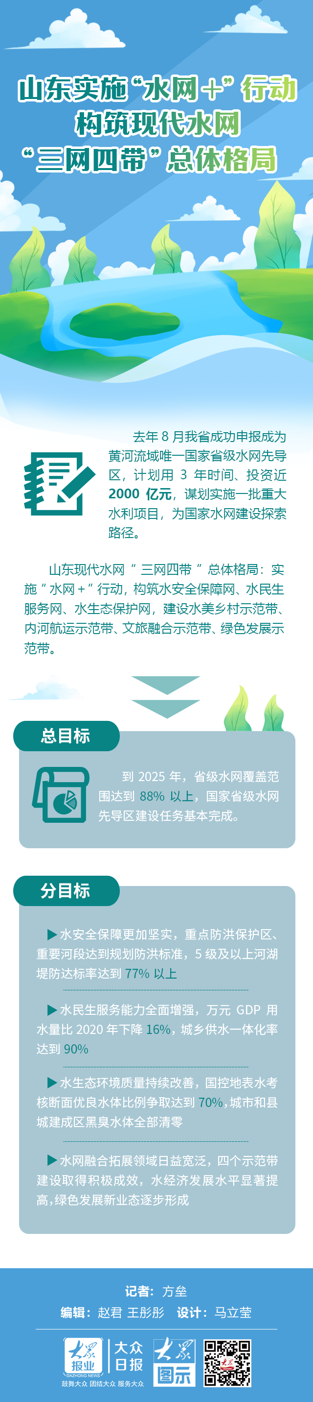 去年8月山東省成功申報(bào)成為黃河流域唯一國(guó)家省級(jí)水網(wǎng)先導(dǎo)區(qū),計(jì)劃用3年時(shí)間、投資近2000億元,謀劃實(shí)施一批重大水利項(xiàng)目,為國(guó)家水網(wǎng)建設(shè)探索路徑。“《意見(jiàn)》圍繞保障水安全、保護(hù)水生態(tài)、發(fā)展水經(jīng)濟(jì)、改善水民生,以更高站位、更寬視野、更大格局對(duì)先導(dǎo)區(qū)建設(shè)作出進(jìn)一步安排部署,提出的多項(xiàng)舉措在山東治水史上具有開(kāi)創(chuàng)性意義。”副省長(zhǎng)陳平介紹,山東省將實(shí)施“水網(wǎng)+”行動(dòng),構(gòu)筑水安全保障網(wǎng)、水民生服務(wù)網(wǎng)、水生態(tài)保護(hù)網(wǎng),建設(shè)水美鄉(xiāng)村示范帶、內(nèi)河航運(yùn)示范帶、文旅融合示范帶、綠色發(fā)展示范帶,推動(dòng)形成“三網(wǎng)四帶”總體格局,全面提升現(xiàn)代水網(wǎng)綜合效益。