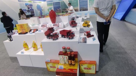 在長(zhǎng)沙國(guó)際會(huì)展中心W1館,山東省的活動(dòng)形象展廳里集中展示了此次參展的企業(yè)產(chǎn)品。從山東人生活中熟悉的“崔字牌小磨香油”、“青島啤酒”等,到日常難得一見的“農(nóng)用機(jī)械”“工程車輛”模型都出現(xiàn)在展廳中。