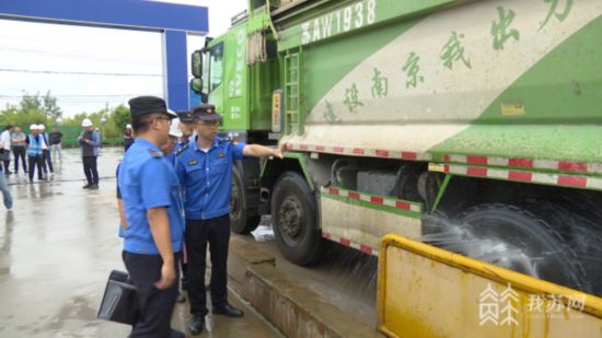 城管執(zhí)法人員對(duì)工地建設(shè)人員說:“現(xiàn)在這個(gè)沖洗平臺(tái)只能沖到車輪的位置,但是車廂的廂板是沖不到的,根據(jù)《南京市渣土管理辦法》第26條的規(guī)定,你們要進(jìn)行整改。”