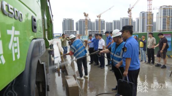 9月14日上午,記者來到南京市六合區(qū)龍袍新城一處經(jīng)濟(jì)適用房在建項(xiàng)目時(shí)看到,城管執(zhí)法隊(duì)員正在對(duì)未規(guī)范設(shè)置的渣土車沖洗臺(tái),現(xiàn)場(chǎng)督促整改。與以往每次一個(gè)執(zhí)法中隊(duì)只檢查一項(xiàng)不同,此次來到現(xiàn)場(chǎng)的還有屬地街道和區(qū)級(jí)直屬專業(yè)中隊(duì)的3組人員,檢查內(nèi)容涵蓋渣土運(yùn)輸、排水管理、門前三包、規(guī)劃驗(yàn)線等多項(xiàng)內(nèi)容。
