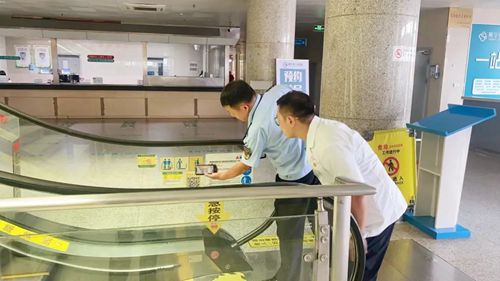 △10月1日,執(zhí)法人員對醫(yī)院在用電梯進行檢查。