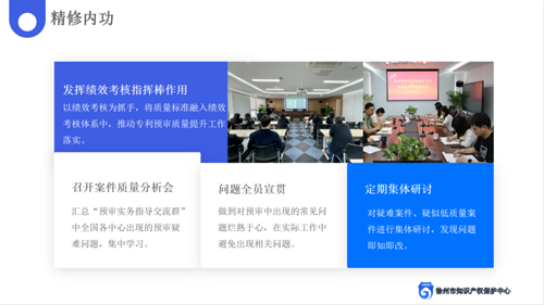 發(fā)揮績效考核“指揮棒”作用,將質(zhì)量標準融入績效考核體系中,推動專利預(yù)審質(zhì)量提升工作的落實。通過每月召開2次案件質(zhì)量分析會,匯總預(yù)審疑難問題,進行集中學(xué)習(xí),做到“一事不二問,一錯不二犯”。定期對疑難案件、疑似低質(zhì)量案件進行集體研討,發(fā)現(xiàn)問題即知即改。專門邀請國家知識產(chǎn)權(quán)局專家、審協(xié)江蘇中心的資深審查員前來中心開展“專利預(yù)審質(zhì)量提升系列培訓(xùn)”,貼合預(yù)審服務(wù)工作實際定制課程,全面提高徐州中心預(yù)審員的檢索技能、專業(yè)技術(shù)知識更新能力和法律適用水平。