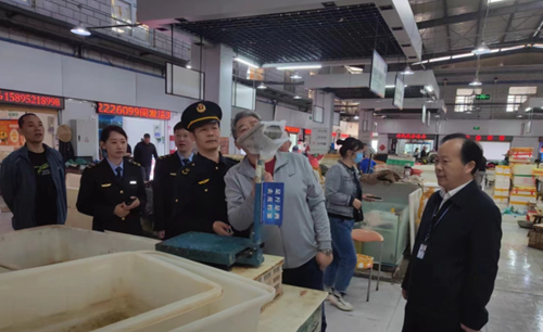 在開明海產(chǎn)品市場、七里溝農(nóng)副產(chǎn)品批發(fā)市場,檢查人員對市場公平秤進行確認(rèn),用標(biāo)準(zhǔn)砝碼對蔬菜、肉食、水產(chǎn)品等攤位的電子秤進行檢定,檢查是否存在 “短斤少兩”的行為。