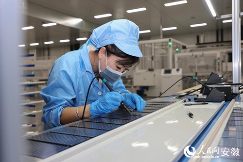 6月19日,人民網(wǎng)記者走進杜集區(qū)伊特納能源科技公司3號組件車間內(nèi),只見全自動智能制造生產(chǎn)線高速運轉(zhuǎn),機械臂揮舞不停,各種設(shè)備馬力全開地進行太陽能電池片的紅外焊接作業(yè)。