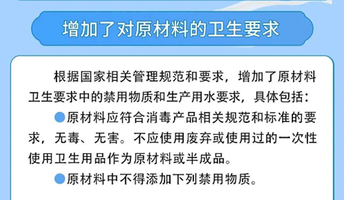 二是細化了原材料衛(wèi)生要求,增加了原材料禁用物質(zhì)和生產(chǎn)用水要求。