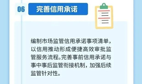 六是完善信用承諾,編制市場監(jiān)管信用承諾事項清單,完善事前信用承諾與事中事后監(jiān)管銜接機(jī)制。
