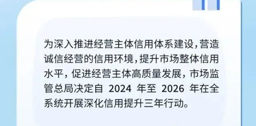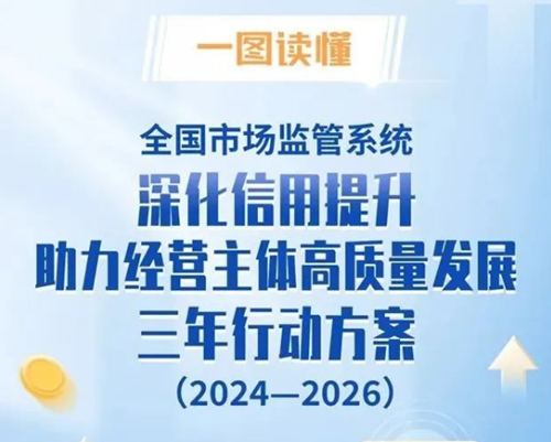 近日,市場監(jiān)管總局印發(fā)《全國市場監(jiān)管系統(tǒng)深化信用提升助力經(jīng)營主體高質(zhì)量發(fā)展三年行動方案(2024—2026)》。這是市場監(jiān)管總局貫徹落實黨中央、國務(wù)院關(guān)于完善社會信用制度決策部署的具體舉措,也是加快建設(shè)以信用為基礎(chǔ)的新型監(jiān)管機(jī)制、營造誠信經(jīng)營的信用環(huán)境、助力經(jīng)營主體高質(zhì)量發(fā)展的系列政策。