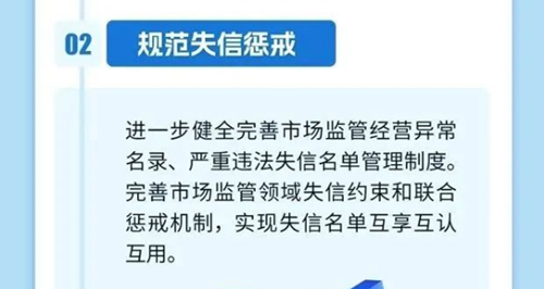 二是規(guī)范失信懲戒,健全完善經(jīng)營異常名錄、嚴(yán)重違法失信名單管理制度和聯(lián)合懲戒機(jī)制。