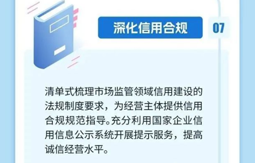 七是深化信用合規(guī),制定信用合規(guī)建設(shè)指南,利用國家企業(yè)信用信息公示系統(tǒng)開展提示服務(wù),鼓勵和引導(dǎo)經(jīng)營主體從多方面加強(qiáng)信用合規(guī)建設(shè),提高經(jīng)營主體信用合規(guī)能力和市場競爭力。