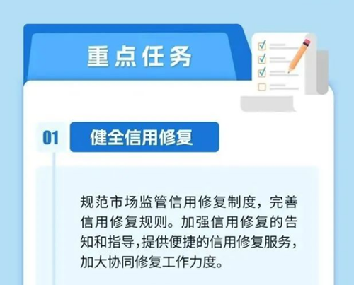 一是健全信用修復(fù),規(guī)范市場監(jiān)管信用修復(fù)制度,加強(qiáng)信用修復(fù)的告知和指導(dǎo),提供便捷的信用修復(fù)服務(wù)。