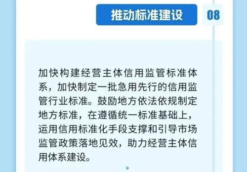 八是推動標(biāo)準(zhǔn)建設(shè),加快構(gòu)建經(jīng)營主體信用監(jiān)管標(biāo)準(zhǔn)體系,鼓勵各地依法依規(guī)制定地方標(biāo)準(zhǔn)。