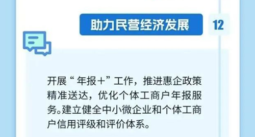 十二是助力民營經(jīng)濟(jì)發(fā)展,持續(xù)創(chuàng)新服務(wù)民營經(jīng)濟(jì)發(fā)展的信用機(jī)制,建立健全中小微企業(yè)和個體工商戶信用評級和評價體系,加強(qiáng)大型企業(yè)逾期未支付款項情況公示和抽查工作,為民營企業(yè)提供發(fā)展便利。