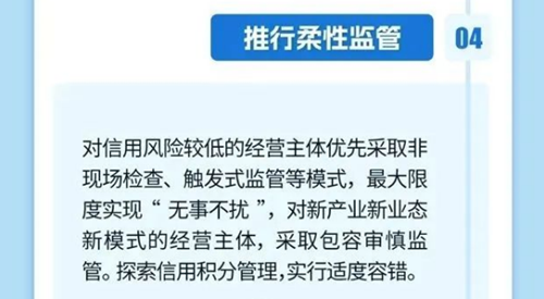 四是推行柔性監(jiān)管,最大限度實現(xiàn)“無事不擾”,對新產(chǎn)業(yè)新業(yè)態(tài)新模式的經(jīng)營主體,采取包容審慎監(jiān)管。