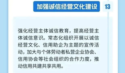 十三是加強(qiáng)誠信經(jīng)營文化建設(shè),開展涉及信用建設(shè)法律法規(guī)的宣貫,常態(tài)化組織開展以誠信經(jīng)營文化、信用助企為主題的宣傳活動,加大與社會組織的合作力度,推動信用共建共享共用。