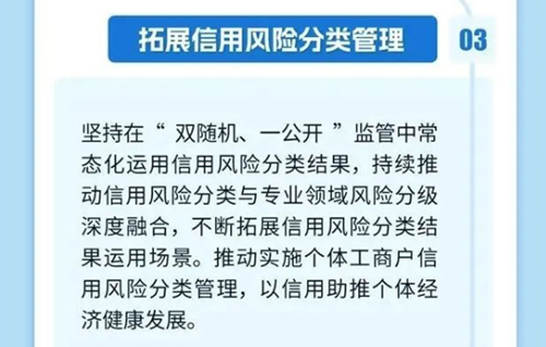 三是拓展信用風(fēng)險分類管理,深入推進(jìn)企業(yè)信用風(fēng)險分類管理,在“雙隨機(jī)、一公開”監(jiān)管中常態(tài)化運(yùn)用信用風(fēng)險分類結(jié)果,推動實施個體工商戶信用風(fēng)險分類管理。