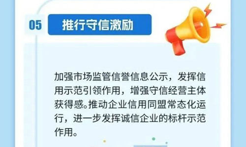 五是推行守信激勵,加強(qiáng)市場監(jiān)管信譽(yù)信息公示,不斷豐富守信激勵在市場監(jiān)管領(lǐng)域的運(yùn)用場景,推動企業(yè)信用同盟常態(tài)化運(yùn)行。