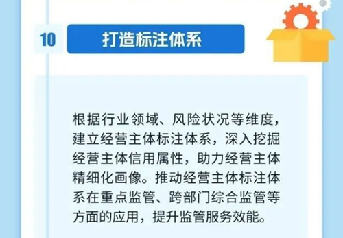 十是打造標(biāo)注體系,建立經(jīng)營主體標(biāo)注體系、標(biāo)注規(guī)則,推動經(jīng)營主體標(biāo)注體系在重點監(jiān)管、跨部門綜合監(jiān)管等方面的應(yīng)用。