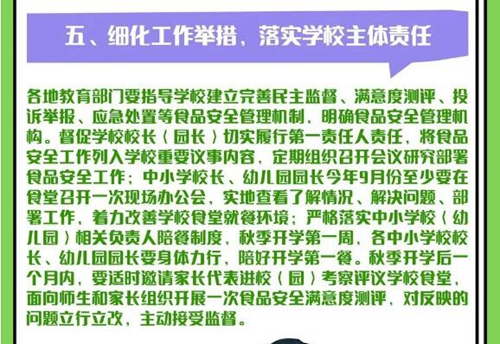 中小學(xué)校長、幼兒園園長今年9月至少要在食堂召開一次現(xiàn)場(chǎng)辦公會(huì),著力改善學(xué)校食堂就餐環(huán)境;要嚴(yán)格落實(shí)中小學(xué)校(幼兒園)相關(guān)負(fù)責(zé)人陪餐制度;要開展食源性疾病預(yù)防和營養(yǎng)健康宣傳教育,倡導(dǎo)學(xué)生餐食減油、減鹽、減糖。