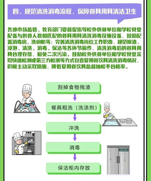 學(xué)校食堂要合理布局各環(huán)節(jié)流程,設(shè)置食品貯存、初加工、切配、烹飪、餐用具清洗消毒等場(chǎng)所。定期開展“三防”設(shè)備設(shè)施清潔維護(hù),防止有害生物入侵和孳生。配備與供餐人數(shù)相匹配的餐具用具清洗消毒設(shè)施設(shè)備,完善清洗消毒崗位工作職責(zé),規(guī)范各環(huán)節(jié)操作,保障餐具用具潔凈。
